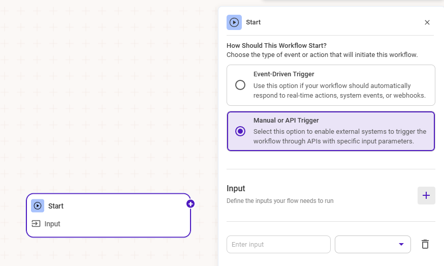 A workflow begins with the Start Node. The Start Node is an essential component that defines how a workflow is initiated