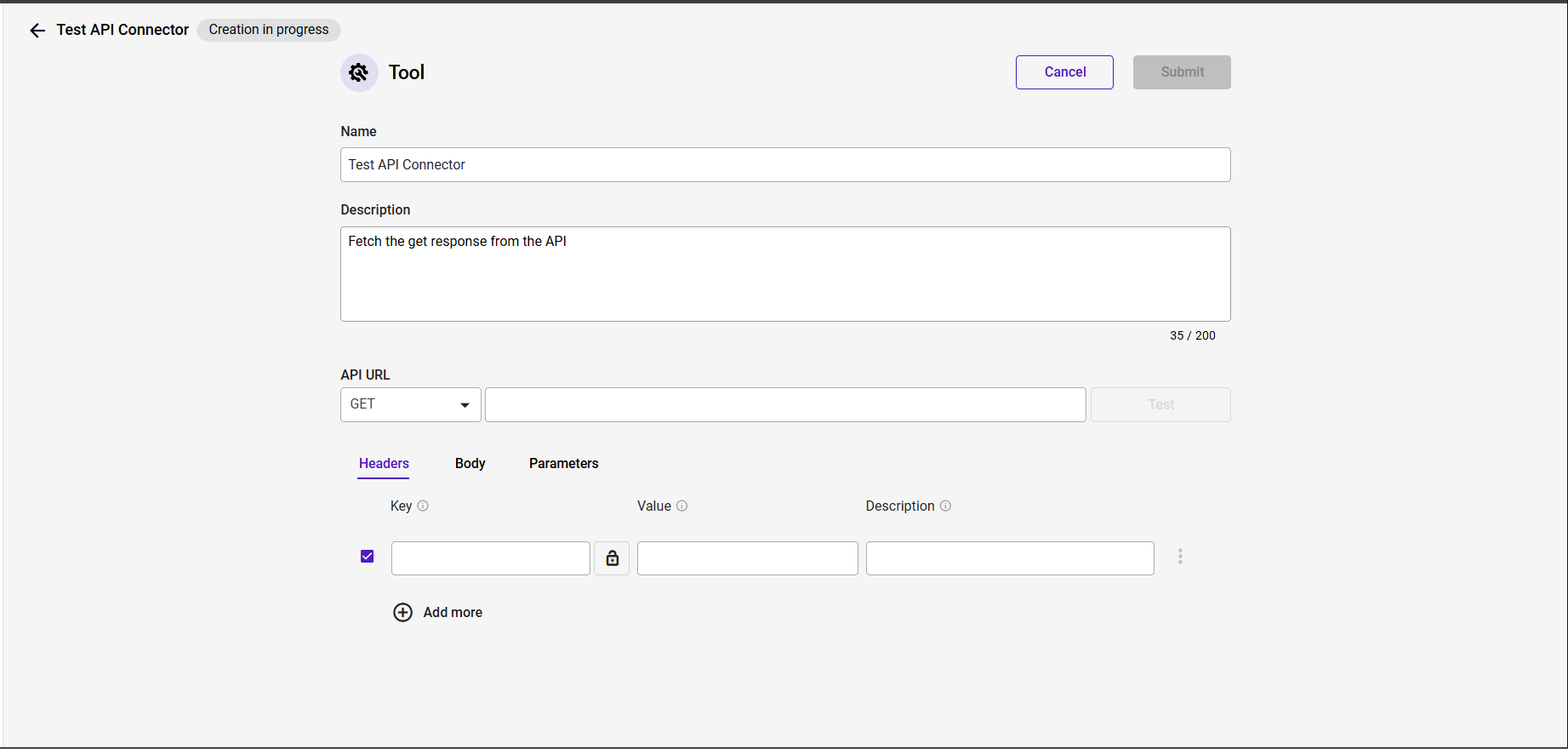Submit: Once satisfied with the test results, click Submit to create and save your API tool.