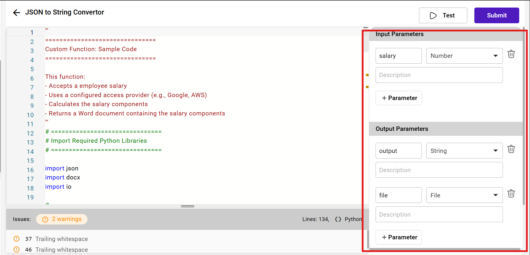 The function’s return statement is a Python dictionary. The keys in this dictionary must exactly match the Parameter Names you configured in the Output Parameters section.