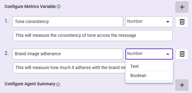 Note: Only Number and Boolean metric variables will be available for adding in score aggregations (Agent Summary). Average can be aggregated for the Number data type, and ‘Count of’ can be aggregated for the Boolean data type