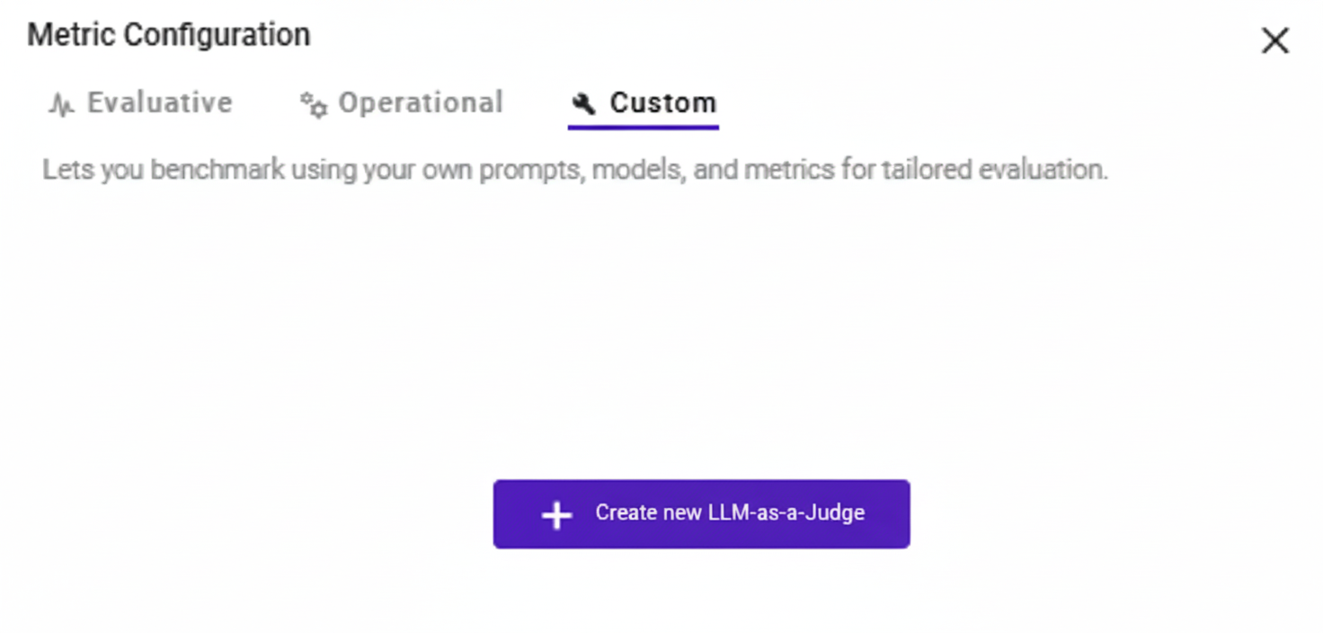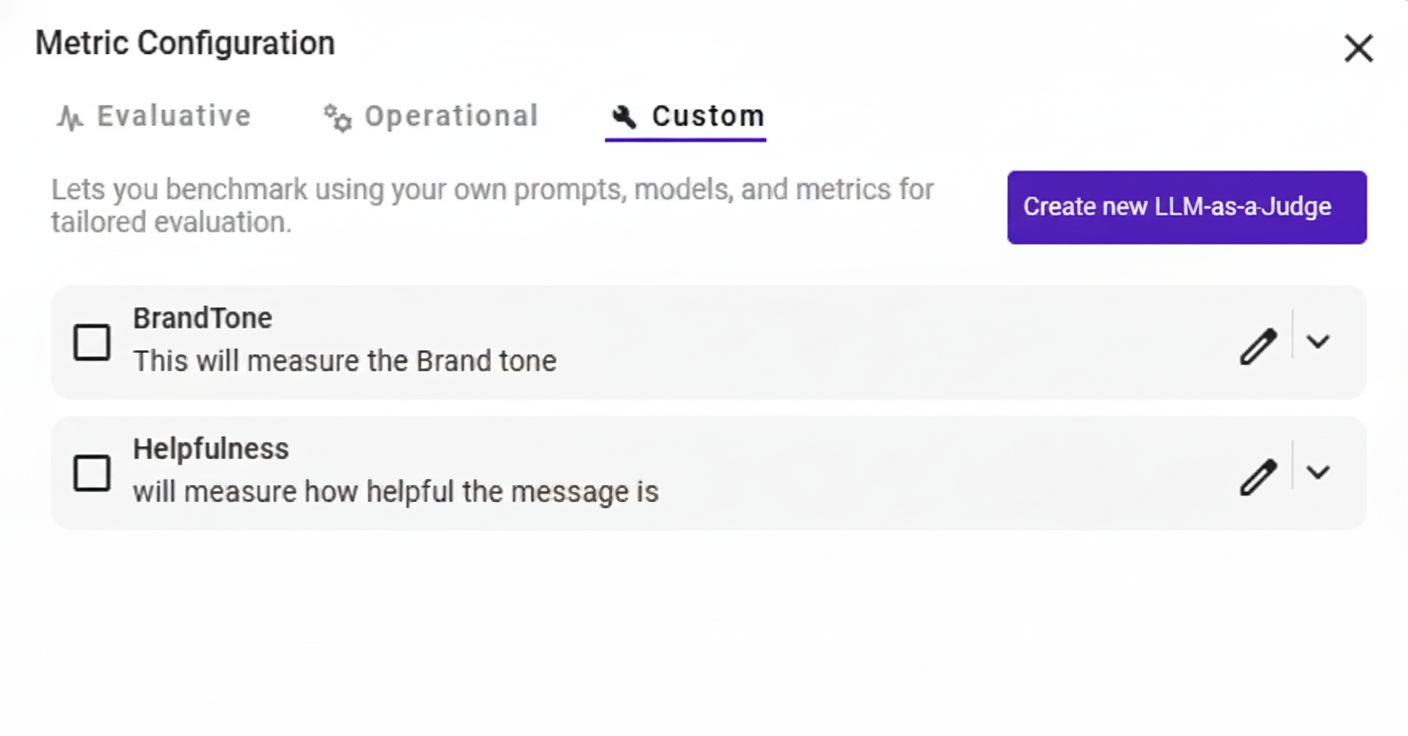 You can select or deselect specific metrics in benchmarking, with scores updating without triggering additional LLM runs, reducing both cost and latency.